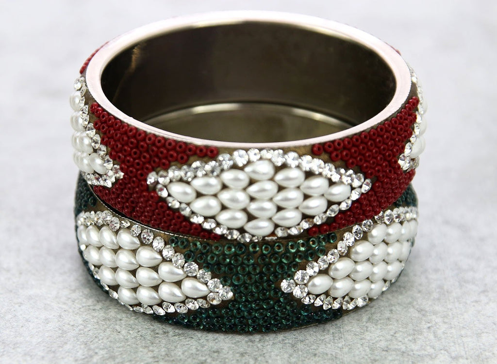 These eye-catching pearl, crystal, and brass bangles will instantly turn the dial up on any look! Wear them alone or with your other favorite pieces.